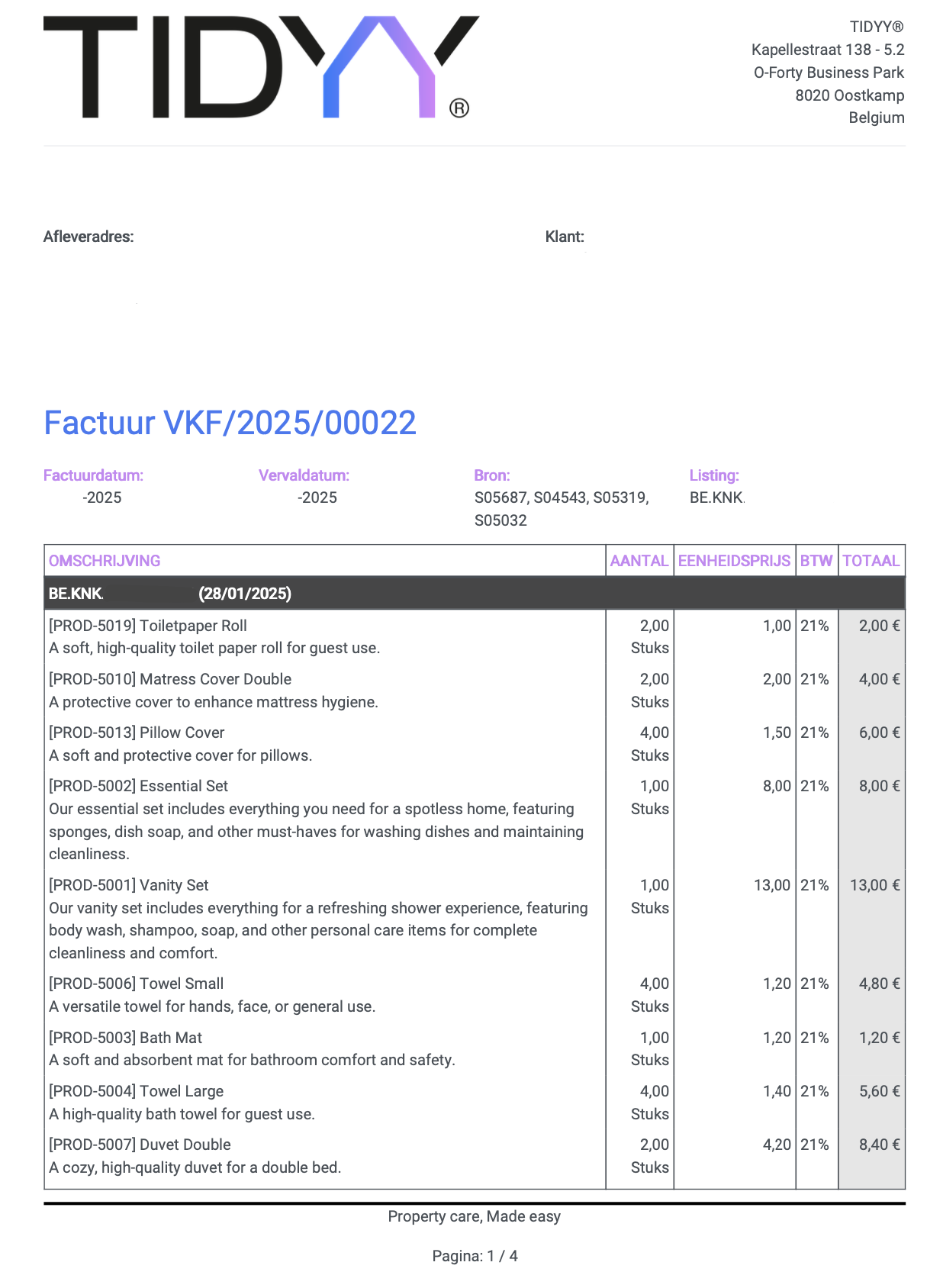 De TIDYY-factuur biedt een helder overzicht van alle taken die in een bepaalde maand zijn uitgevoerd. Sommige kosten komen maandelijks terug, terwijl andere afhankelijk zijn van specifieke opdrachten (zoals reservaties).